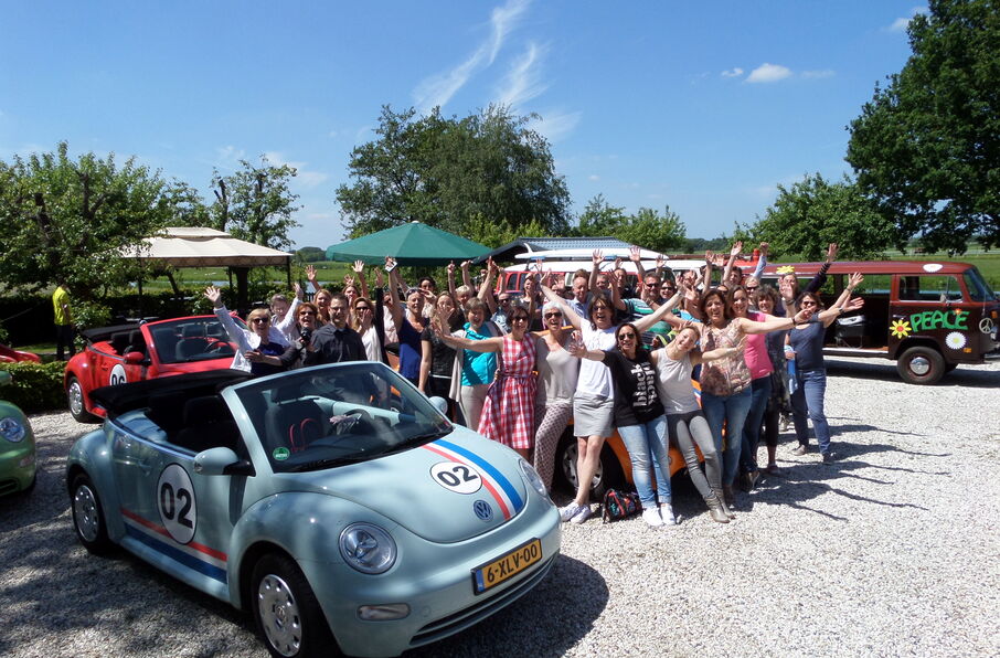 Kever Cabrio 't Groene hart organiseert bedrijfsuitjes, teambuilding en groepsuitjes op basis van een mooie, uitdagende rally/puzzeltocht met Cabrio New Beetles en Old Timer T2 Volkswagen hippie busjes.