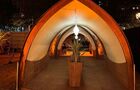 De strohboid tent is een Co2 neutrale tent en geheel uit hout vervaardigd.