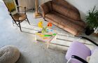 Vroeger een loods van een aannemersbedrijf, nu eigenlijk een hele grote woonkamer! Kleurrijk en huiselijk ingericht. studio ZUKS bestaat uit twee delen: de grote loods/huiskamer en het kantoortje.
