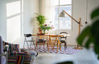 De loods kan op veel manieren gebruikt worden. Er hangen mooie lichte linnen gordijnen waarmee je de ruimte in tweeën kunt delen. Ook voor de karakteristieke grote ramen hangen gordijnen. Samen met de planten in de ruimte zorgen ze voor een huiselijk en warm gevoel. Industrieel en warm tegelijkertijd!