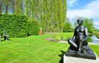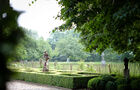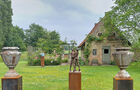 Een grote tuin met majestueuze bomen, rozenperken, vijver, boomgaard en weide maken het plaatje compleet.