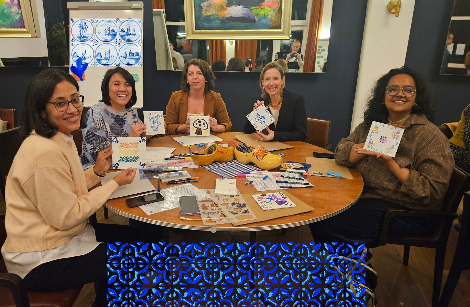 Door middel van sjablonen en boekjes vol teksten gaat iedereen creatief aan de slag met een eigen Delftsblauw tegeltje. Uiteraard krijgt men deze mee naar huis. Op de achterkant wordt een ophangoogje geplakt, zodat het daadwerkelijk aan de muur opgehangen kan worden. 2 Begeleiders nemen de tegeltjes mee en genoeg sneldrogende verfstiften.