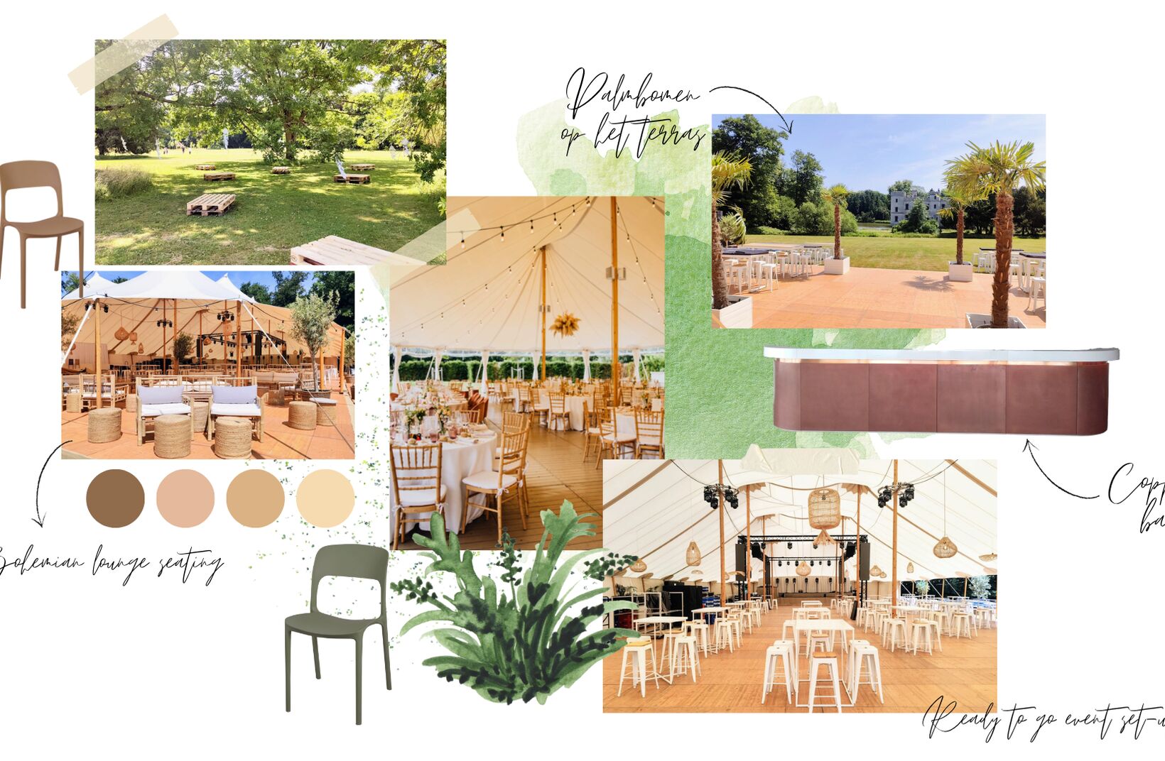 Onze Pop-Up Silhouette Tent is standaard voorzien van bohemian meubilair en stijlvolle lounge seating. Een warme, ontspannen stijl die naadloos aansluit bij het groene kader van de Plantentuin.